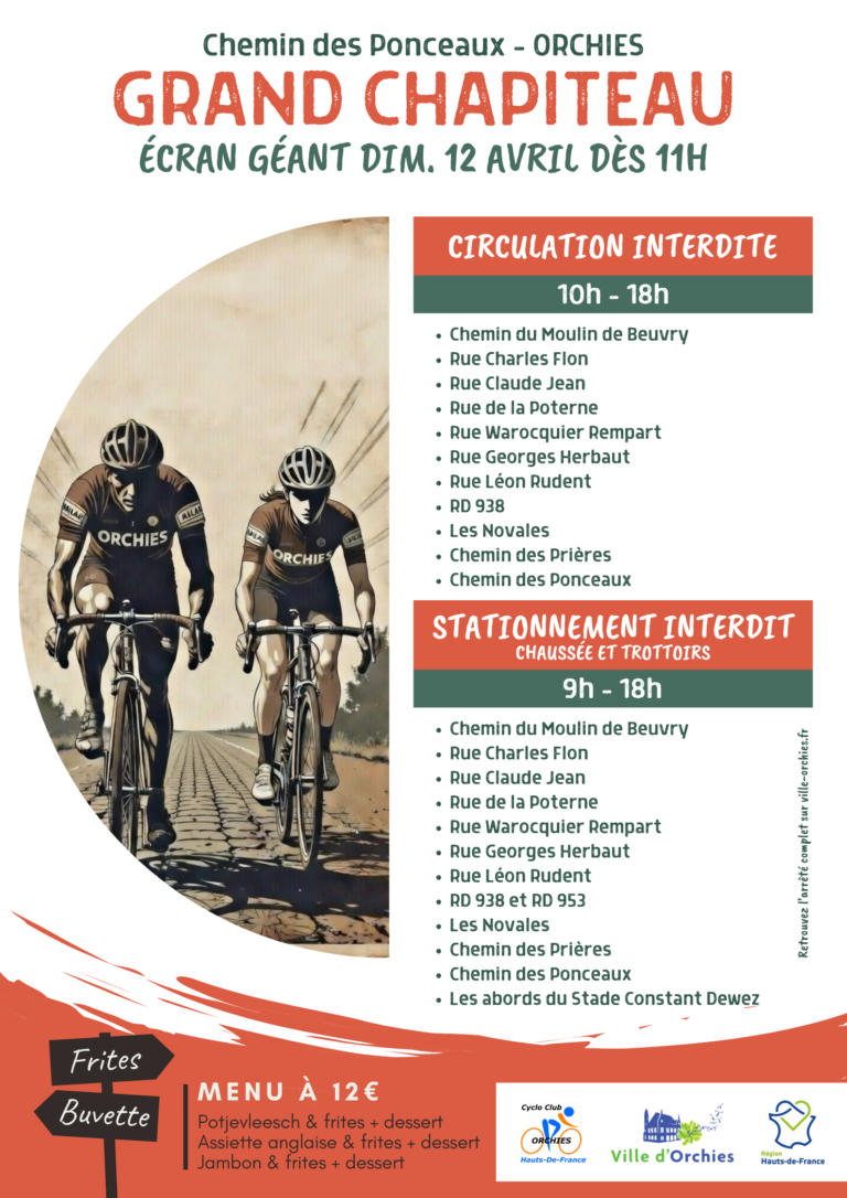 Les festivités commenceront dès 11h au Chemin des Ponceaux, avec un grand chapiteau, un écran géant et des stands de restauration. Le Cyclo Club d’Orchies y proposera notamment son traditionnel Potjevleesch.